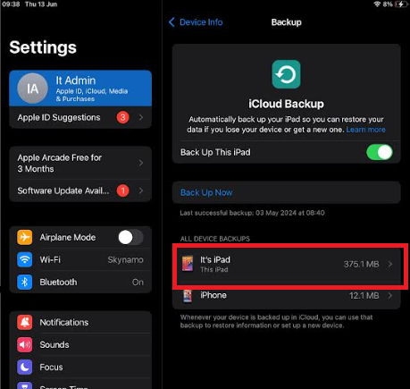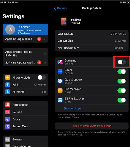 -Settings -> Your profile -> This iPad/iPhone -> iCloud backup -> This iPad/iPhone -> Untick Skynamo and Delete. Please make sure that the button next to Skynamo is grey